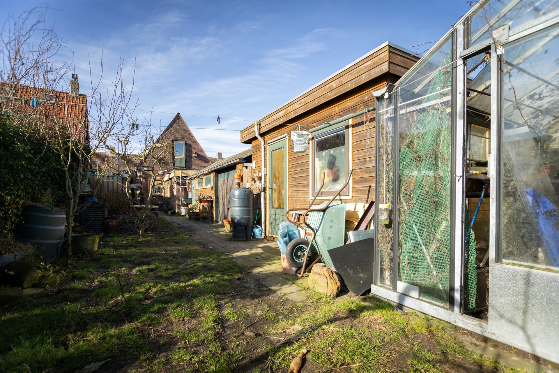 De achtertuin heeft door zijn diepte van ca. 27.5m2 de hele dag zon of als het te warm is is ook zitten in de schaduw goed mogelijk. Er zijn een drietal schuren aanwezig zodat er genoeg ruimte is voor een hobby. Door het maken van een oprit aan de straatzijde is het mogelijk om met een kar langs het huis in de tuin te komen.